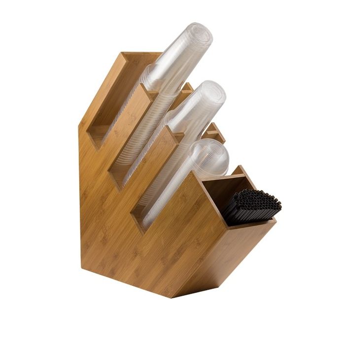 In deze bamboe bekerhouder presenteert u kartonnen koffiebekers, CPLA koffiedeksels, PLA drinkbekers en rietjes. Zo ziet uw buffet of koffiecorner er strak en opgeruimd uit. Bamboe bekerhouders geven een natuurlijke, ambachtelijke uitstraling aan uw buffet of foodconcept.