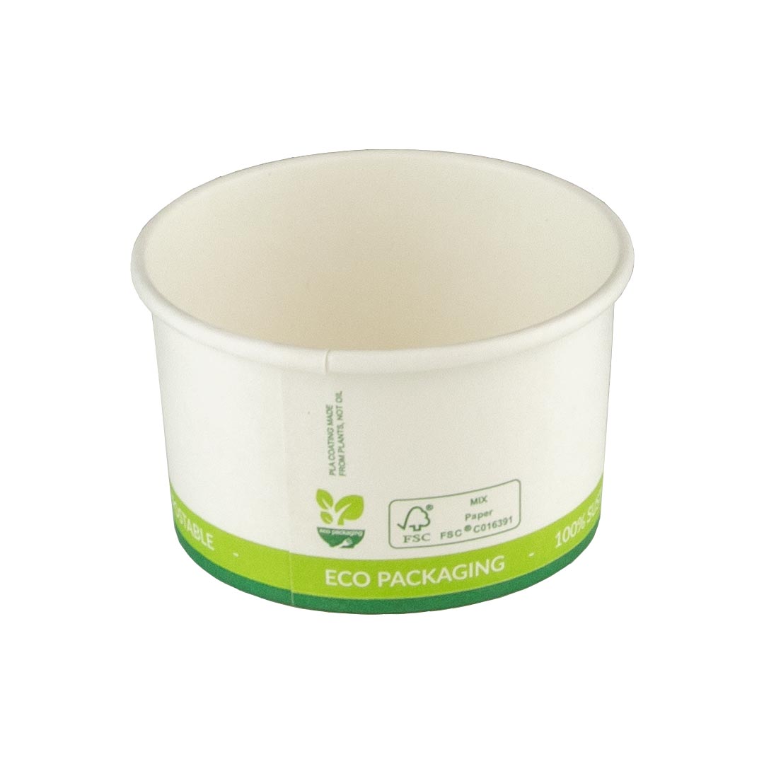 De FSC® kartonnen ijsbeker 3oz/90ml met PLA coating is voornamelijk geschikt voor het serveren van een bolletje ijs. Combineer de duurzame ijsbekers met onze afbreekbare ijslepels.