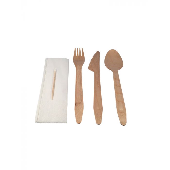 Deze FSC® bestekset bestaat uit een houten mes, lepel, vork, tandenstoker en bruin servet. FSC® houten bestek heeft een natuurlijke uitstraling en kunt u gebruiken voor zowel koude als warm gerechten. Erg handig om mee te geven bij uw takeaway maaltijden.