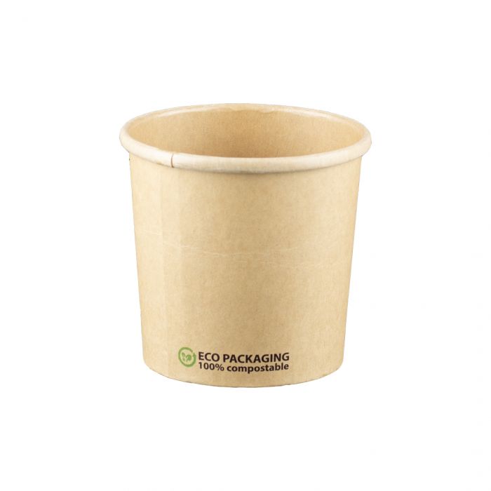 De kraft kartonnen soepbeker ( Soup to go ) 360ml met PLA coating is geschikt voor het verpakken en vervoeren van o.a. warme soep. Door de dikte van het karton werkt de soepbeker isolerend, zodat de inhoudt goed warm blijft en deze dus uitermate geschikt is als takeaway verpakking.