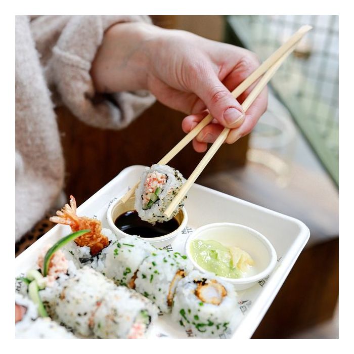 Let op: de houten eetstokjes zitten in een wit zakje verpakt.
