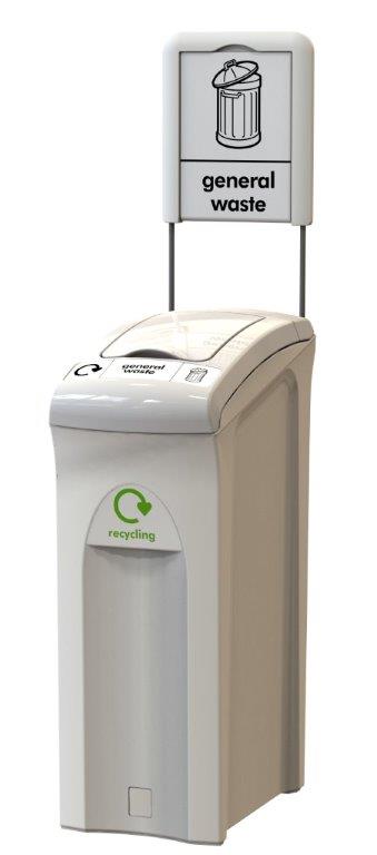 Bordje voor bevestiging aan de Midi Envirobin om de afvalstroom aan te duiden. Bestaande uit 2 stangen die door gegoten ogen aan de achterzijde van de bak lopen. Aan de bovenzijde een gegoten houder in dezelfde kleur als de bak waar een A4-formaat poster in past die de afvalstroom aangeeft (exclusief poster). Totale hoogte: 134,4 cm. , VB 063925 b 210 h 1344, mm