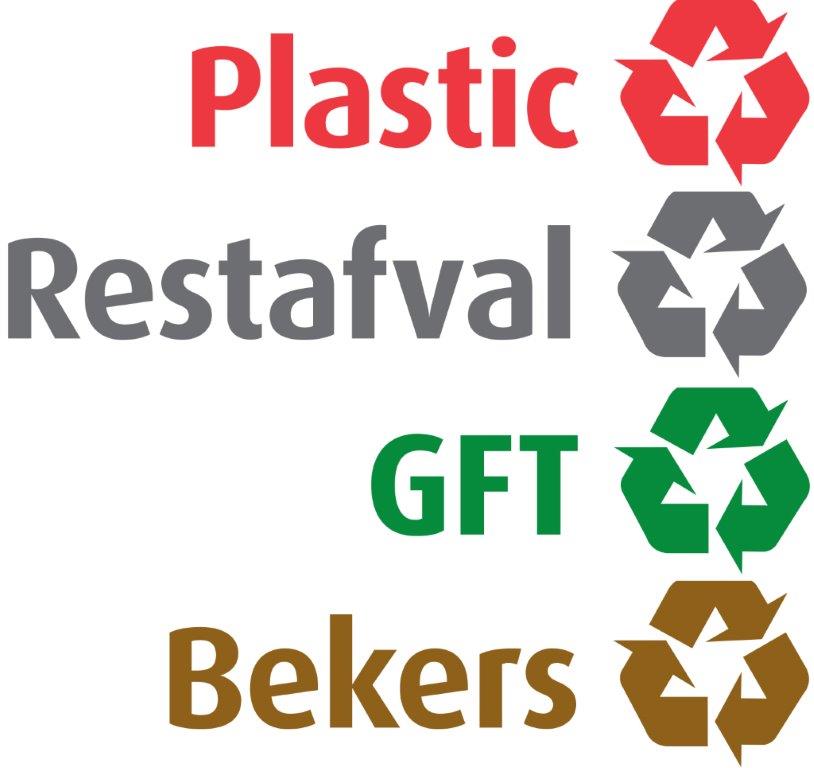 Stickerset voor het aanduiden van de afvalstromen. De set bestaat uit 4 recycling stickers met Nederlandse tekst: Plastic, Restafval, GFT, Bekers. , VB 034833 b 120 h 500, mm