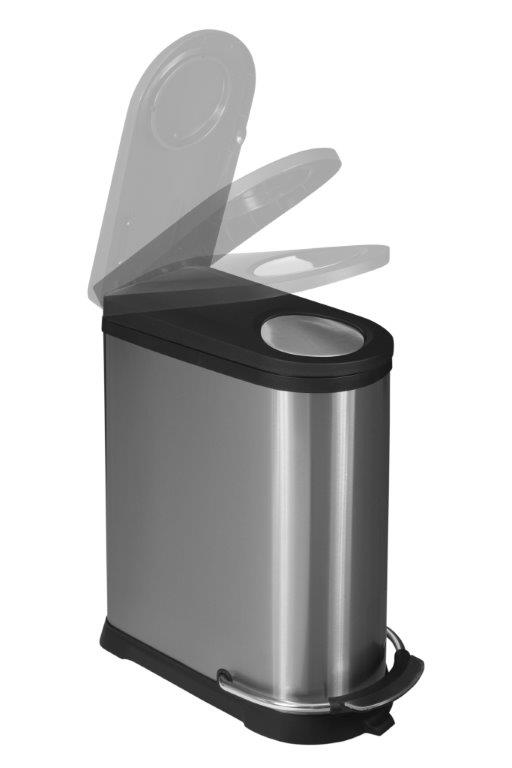 Smalle, halfronde pedaalemmer van mat RVS met 2 kunststof binnenemmers (16 en 20 ltr). Voorzien van gedempt kunststof deksel en stevig metalen pedaalsysteem. Aan de binnenzijde van het deksel is ruimte voor een carbonfilter om geurtjes te voorkomen. Fingerprint Proof. , VB 924836, L 320 b 580 h 690, mm