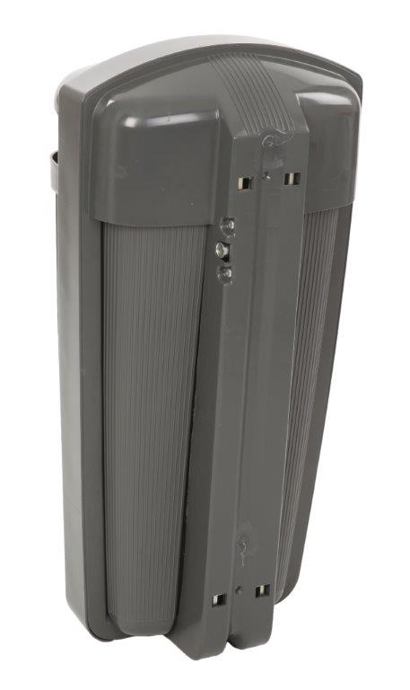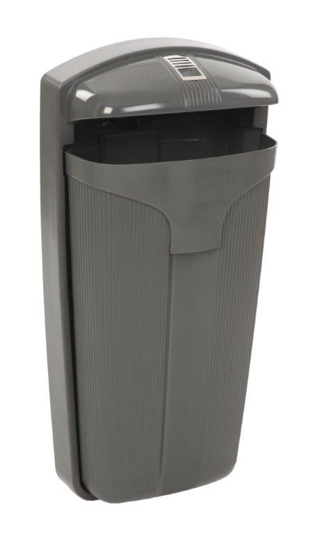 Buitenafvalbak van UV-bestendig geïnjecteerd HDPE voor wand- of paalbevestiging. De kap beschermt tegen inregenen en voorkomt de inworp van volumineus afval. Voorzien van asbak op de top. Na het ontgrendelen via een driekantslot kan de afvalbak via de voorzijde volledig uitgenomen worden. De extra handgreep aan de voorzijde vergemakkelijkt het ledigen. De geribbelde stijllijnen maken het aanbrengen van graffiti moeilijk. , VB 061594, L 330 b 420 h 880, mm