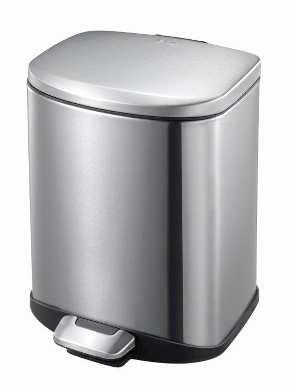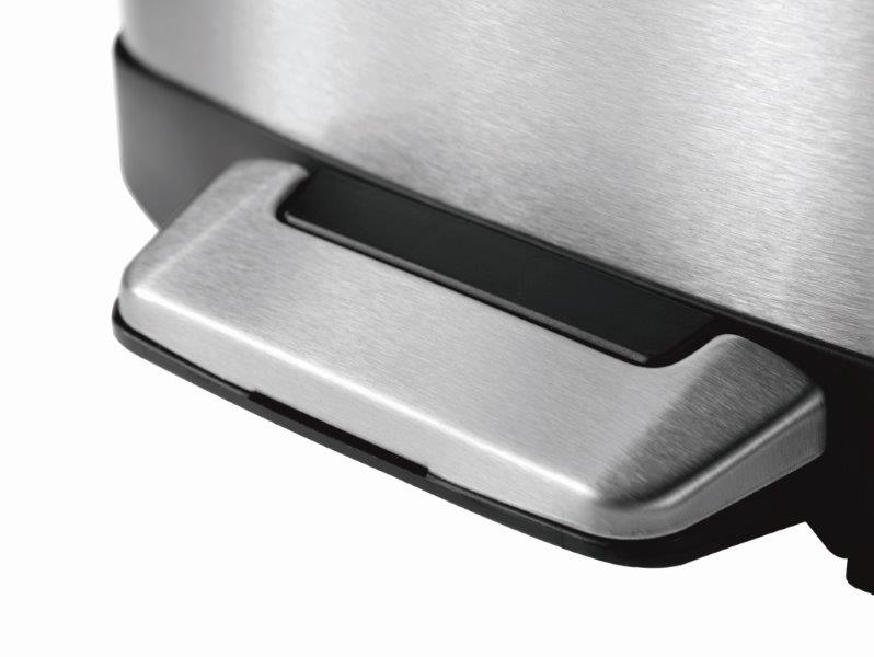 Fraai vormgegeven pedaalemmer van geborsteld RVS met fingerprint proof coating. Voorzien van geruisloos sluitend deksel, kunststof binnenemmer en handgreep aan de achterzijde. , VB 936606, L 234 b 234 h 310, mm