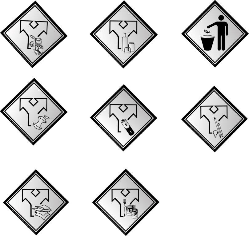 Set van 8 zelfklevende etiketten voor afvalscheiding. , VB 046188, L 120 b 120, mm