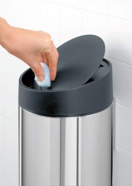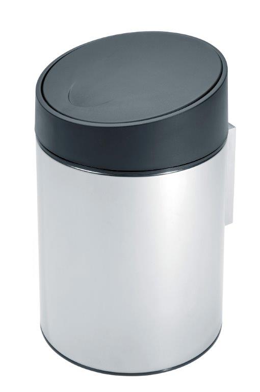 Stijlvol vormgegeven afvalemmer met kunststof binnenemmer voor wandbevestiging. Het deksel gaat met één vloeiende beweging naar binnen/naar boven open en raakt de inhoud van de afvalverzamelaar niet dankzij slim scharniersysteem. , VB 397127, L 218 b 205 h 325 ø 205, mm