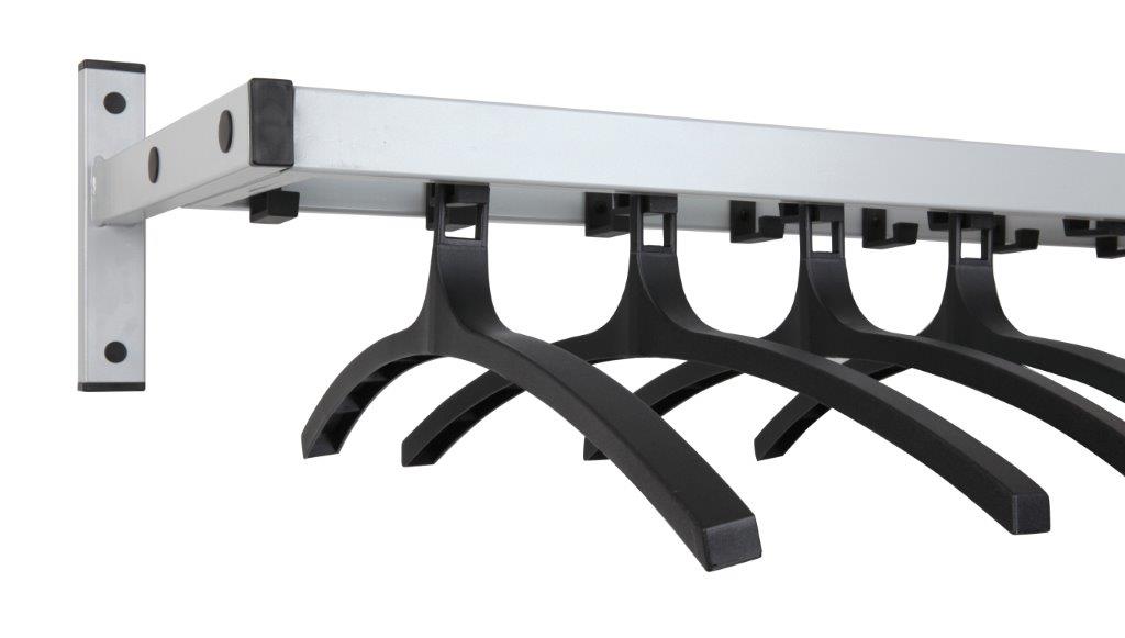 Wandkapstok met een dubbele rij stevige nylon haken (totaal 19 haken). De haken zijn veilig aan de binnenzijde van het frame gemonteerd. Bovenop het rek is ruimte voor accessoires. Optioneel mogelijk om aan de voorste rij haken kledinghangers te hangen. , VB 650095, L 1130 b 450 h 170, mm