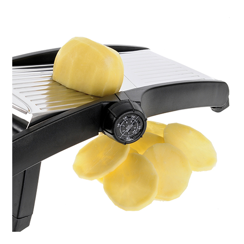 roestvrijstaal/kunststof, inclusief beschermslede en geschikt voor plakjes en julienne, dikte instelbaar.