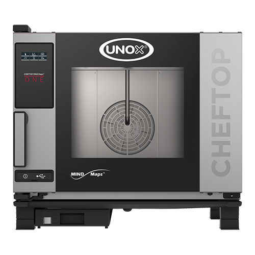 Unox ChefTop Mindmaps One, Combisteamer, greep links, de oven heeft een Master Touch bedieningsscherm, hiermee kunnen gerechten handmatig bereid worden, maar het geeft ook toegang tot een lijst met bereidingscycli die eerder zijn opgeslagen of kunnen er nieuwe recepten gemaakt worden, die vervolgens opgeslagen kunnen worden, afstand tussen de roosters is 67cm, DRY.Maxi voor de ideale luchtvochtigheid, Steam.Maxi voor perfect stomen, Air.Maxi voor een perfecte heteluchtcirculatie, automatische reinigingssysteem Rotor.Klean, Auto.Pure-antikalkfilter, wordt geleverd zonder roosters of bakplaten, capaciteit 5x (1/1GN). Afmetingen (h)68x75x78 cm 230 volt 3000 watt.