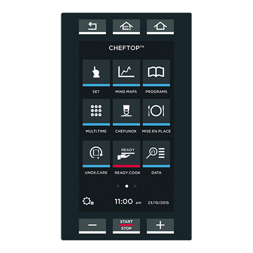 Unox Bakertop Mindmaps PLUS, Hetelucht oven, de oven heeft een Master Touch bedieningsscherm, hiermee kunnen gerechten handmatig bereid worden, maar het geeft ook toegang tot een lijst met bereidingscycli die eerder zijn opgeslagen of kunnen er nieuwe recepten gemaakt worden, die vervolgens opgeslagen kunnen worden, afstand tussen de roosters is 80cm, de oven heeft Adaptive.Cooking, Multi.Time dat stelt u in staat 10 verschillende producten tegelijk te bakken, Mise.en.Place waardoor alle gerechten op dezelfde tijd klaar zijn, Dry.Maxi voor de ideale luchtvochtigheid, Steam.Maxi voor perfect stomen, Air.Maxi voor een perfecte hetelucht circulatie, automatische reinigingssysteem Rotor.Klean en het Auto.Pure-antikalkfilter, wordt geleverd zonder roosters of bakplaten, capaciteit 10x (60x40cm). BakeryNorm. Afmetingen (h)117x86x96 cm (krachtstroom) 400 volt 21000 watt