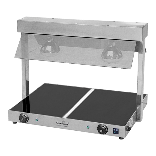 roestvrijstaal 18/10, apart inschakelbare warmhoudplaat keramisch 2x 1/1GN, thermostatisch instelbaar tot 90°C, compleet met hygiënische beschermkap van acrylglas en infra-rood lampen. Afmetingen: (h)57x73x58 cm. 220 volt 1020watt.