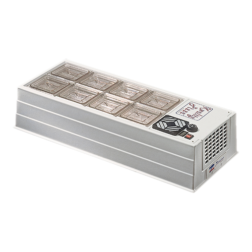 behuizing uit ijzersterk ABS, GN maatvoering voor maximaal 15cm diep, digitaal instelbare thermostaat +2°C/+10 °C en verlichte hoofdschakelaar, wordt zonder GN bakken geleverd. Afmetingen: (h)22x102x41 cm. 220 volt 130 watt
