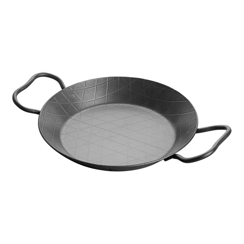 met twee grepen, smeedijzer, geschikt voor gas, uitermate geschikt voor het serveren van éénpansgerechten, met het houten onderbord (apart leverbaar) kan men de pan gebruiken als bord