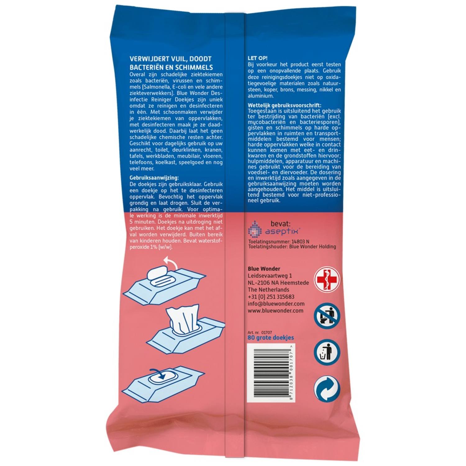 Overal zijn schadelijke ziektekiemen zoals bacteriën, virussen en schimmels (Salmonella, E-coli en vele andere ziekteverwekkers). Blue Wonder Desinfectie Reiniger Doekjes zijn uniek omdat ze reinigen en desinfecteren in één. Met schoonmaken verwijder je ziektekiemen van oppervlakken, met desinfecteren maak je ze daadwerkelijk dood. Daarbij laat het geen schadelijke chemische resten achter. Geschikt voor dagelijks gebruik op uw aanrecht, toilet, deurklinken, kranen, tafels, werkbladen, meubilair, vloeren, telefoons, koelkast, speelgoed en nog veel meer.