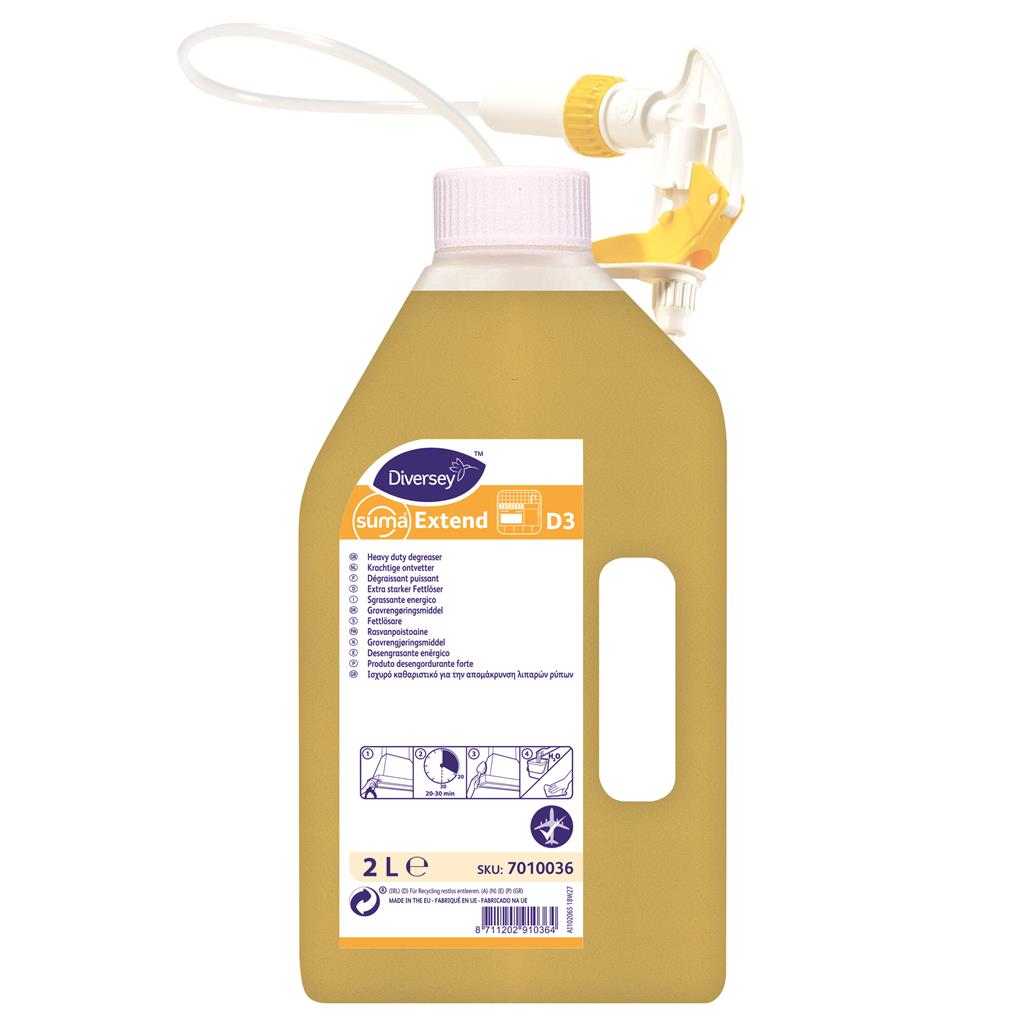 Suma Extend D3 is een mild alkalische ontvetter welke geschikt is voor het handmatig reinigen van alle zwaar vervuilde oppervlakken in de keuken, zoals afzuigkappen en kooktoestellen. Het product is geschikt voor het verwijderen van alle soorten vet en ingedroogde voedselresten. Door de speciale samenstelling kan effectief ontvet worden zonder sterke alkaliteit of gevaarlijke oplosmiddelen. Suma Extend D3 kan worden toegepast op de meeste oppervlakken inclusief kunststof en zachte metalen zoals aluminium.