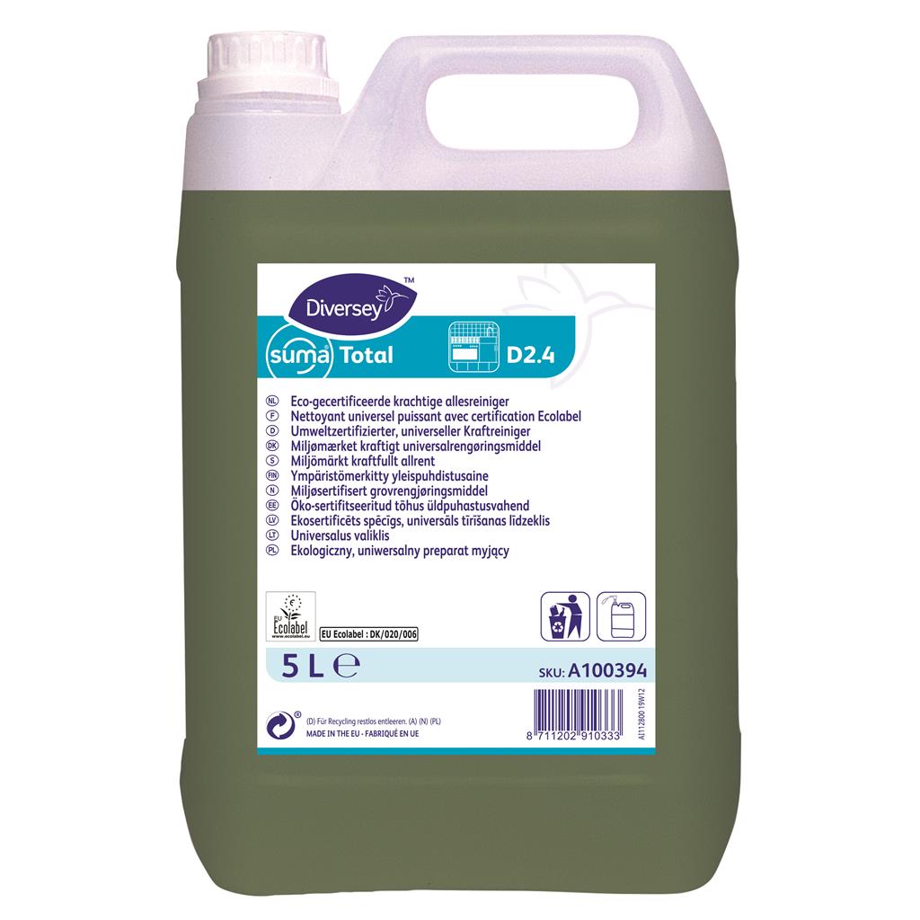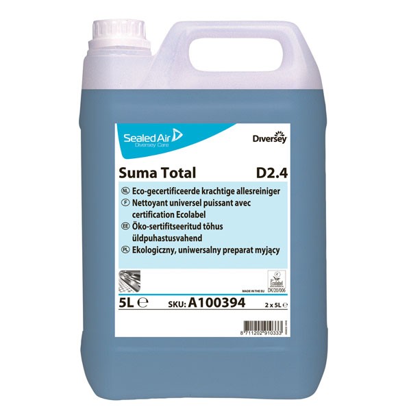 Suma Total D2.4 is een superieure laagschuimende allesreiniger met sterk ontvettende werking. Veilig voor alle te reinigen objecten in de grootkeuken, cafetaria’s, slagerijen, supermarkten en bakkerijen. Zowel handmatig als machinaal toepasbaar.