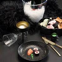 Het relief lijkt ingezet met zwarte steentjes, gevormd tot een MOZAIEK en is zeker een toevoeging voor uw gedekte tafel en een verrrassing voor uw gasten.