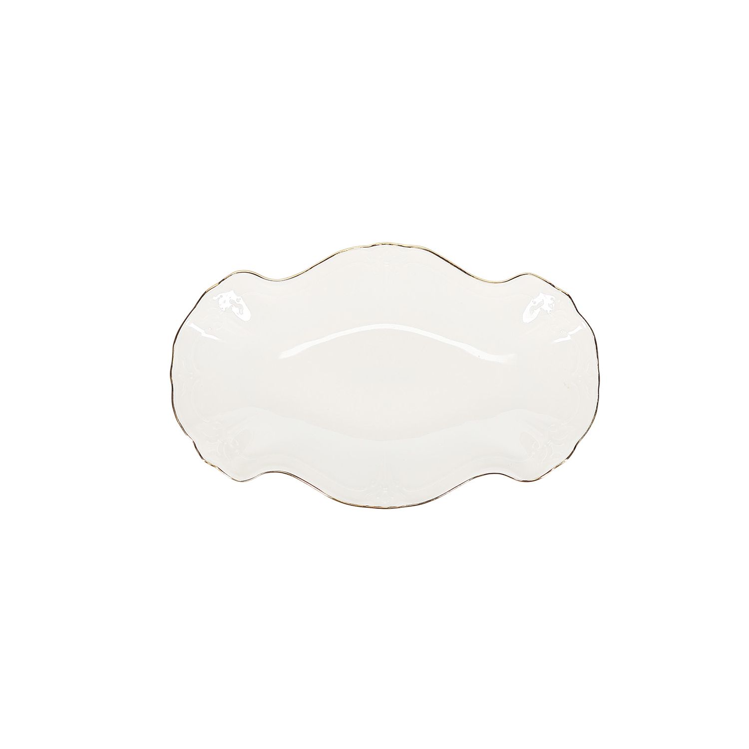 Serveer nostalgie met de 26x16 cm witte serveerschaal met gouden rand uit de Retro-collectie van BonBistro. Dit elegante porseleinen stuk combineert vintage charme met moderne functionaliteit en is perfect voor het presenteren van hapjes, bijgerechten of kleine creaties. Een stijlvolle toevoeging voor elk bistro of café dat oog heeft voor detail.
