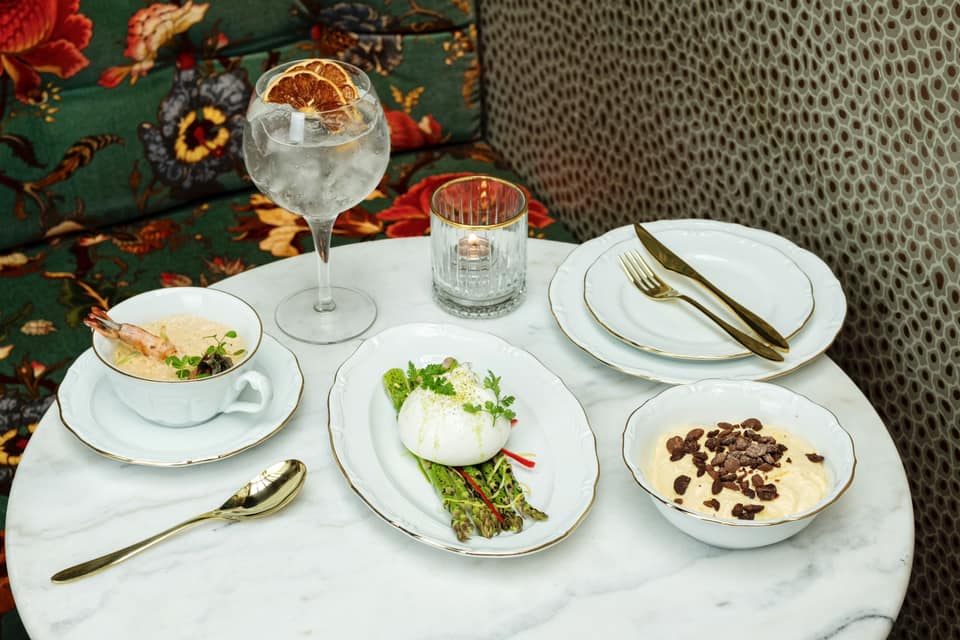Mix met gouden bestek, presentatie materiaal of glaswerk met een gouden rand om de presentatie helemaal af te maken.
