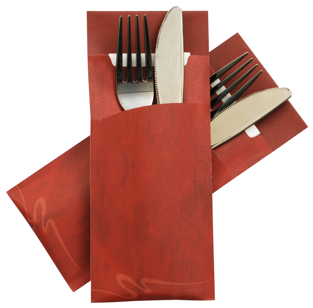 Bestekzakje / pochetto, marble bordeaux, servet wit, G2D, doos 500 stuks.