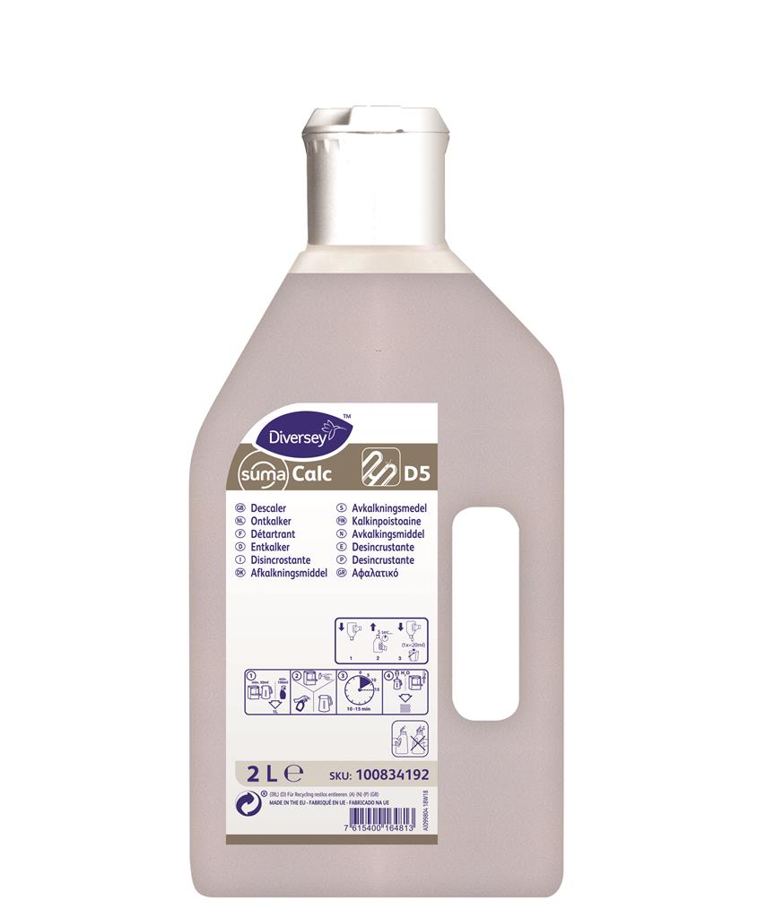Suma Calc D5 is een zuurhoudend reinigingsmiddel voor het verwijderen van kalkafzetting van keukenapparatuur en - hulpmiddelen, inclusief vaatwasmachines, bain-marie’s, boilers, stomers, thee- en koffiemachines, enz.